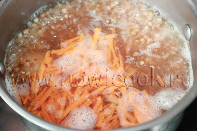 Добавить тертую морковь и мелко нарезанный лук (можно предварительно потушить в небольшом количестве воды с добавлением растительного масла).